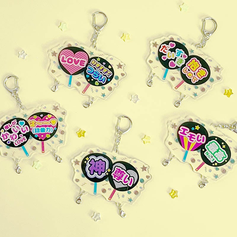 “推し”への愛を熱烈にアプローチしたい方向けの「推しが尊い!」や「だいすき!」といったストレートにアピールする文字タイプのもの、うちわに「神」「エモい」「好きすぎてつらい」など気持ちが綴られたものなども。