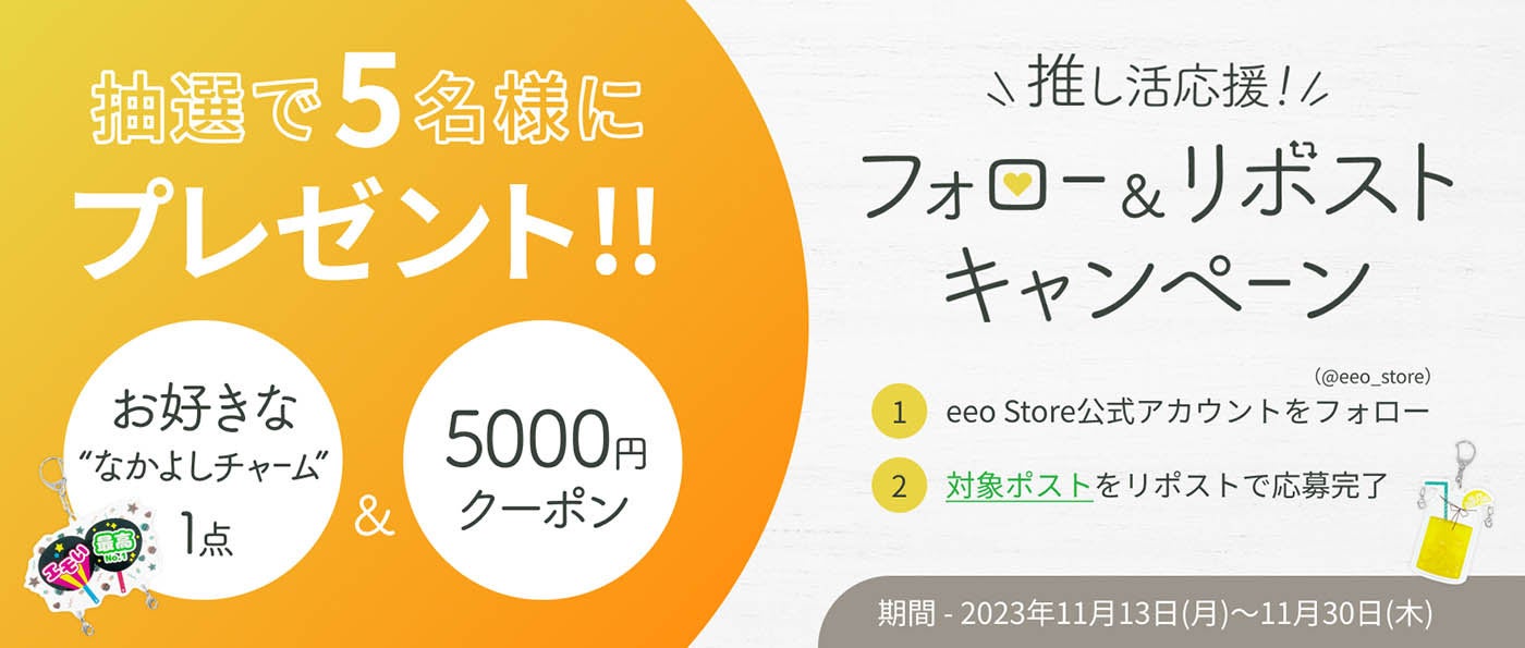 そんな「なかよしチャーム」をはじめとするeeoオリジナルブランドを応援してくださる皆様へ、感謝の気持ちを込めた「“推し活応援!”フォロー&リポストキャンペーン」を11月13日(月)から実施中です!