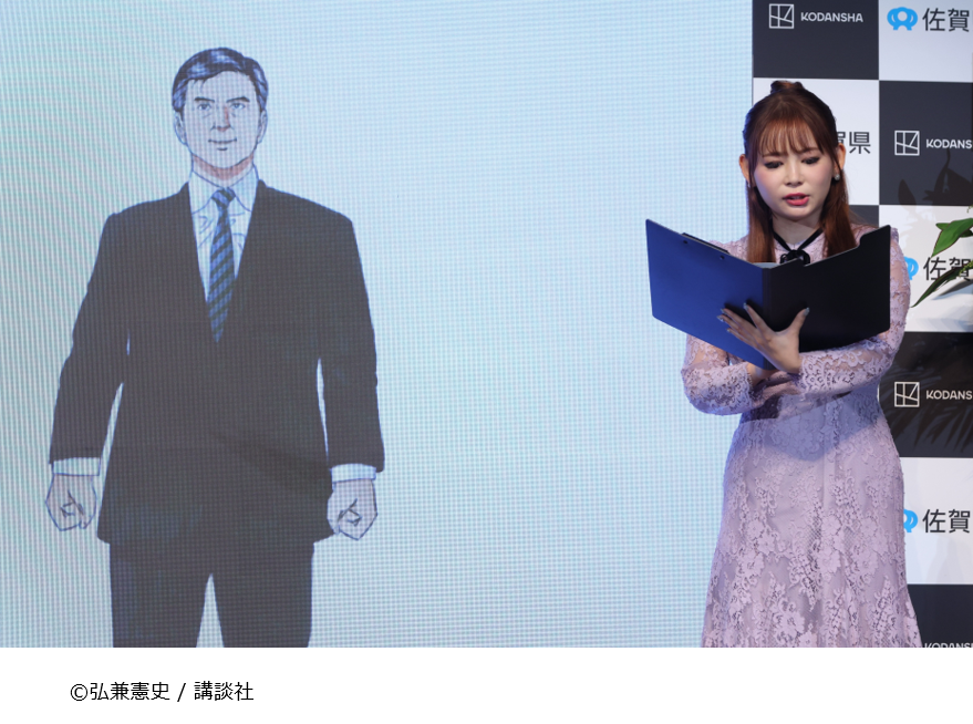 就任式最後には、今回のプロジェクトのために弘兼憲史さん監修のオリジナルマンガ「副知事 島耕作」をお披露目。中川さんと島副知事による公開生朗読を実施しました。実際にオリジナルマンガを朗読した中川さんは「作者の前で読みなんてカオスすぎます!」としながらも「島さんと一緒に朗読することができて本当に幸せです」とコメント。実際に聞いた山口知事は「この漫画の続きがますます読みたくなりました」と発言し、会場を盛り上げました。
