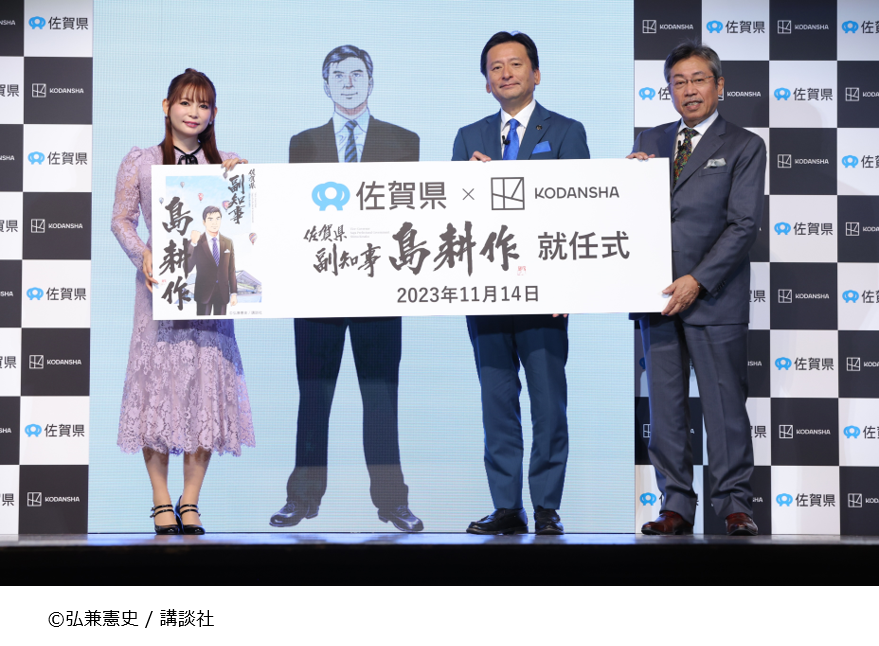 就任式では、「島耕作」の副知事就任を記念して就任式を実施。山口佐賀県知事より辞令書を交付しました。副知事就任に際し、島さんは「最初は正直びっくりいたしました」としつつも「佐賀県の皆様に大きな還元ができるよう全力で公務に取り組んで参ります」と副知事としての意気込みを語りました。