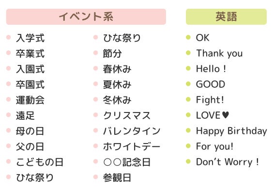 テキスト部分はお名前を入れたり、メッセージにしたり、テキストを入れずにイラストのみでつくることもできます。