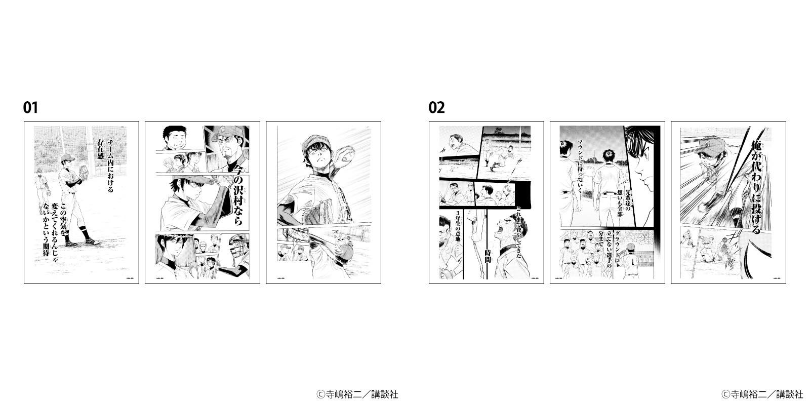 REPLICA GENGAには、作中で使用された名シーンが使用されており、今回3枚セットになったのは、監督やメンバーたちが沢村に期待し見守る場面と、先輩たちの想いを胸に投球する沢村のシーンです!