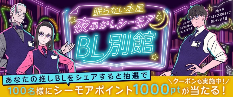 あなたが選んだオススメBL作品と「#眠らない本屋夜ふかしシーモアBL別館」をつけてシェアしてください。シェアした方の中から抽選で100名様にシーモアポイント1000ptをプレゼントします。