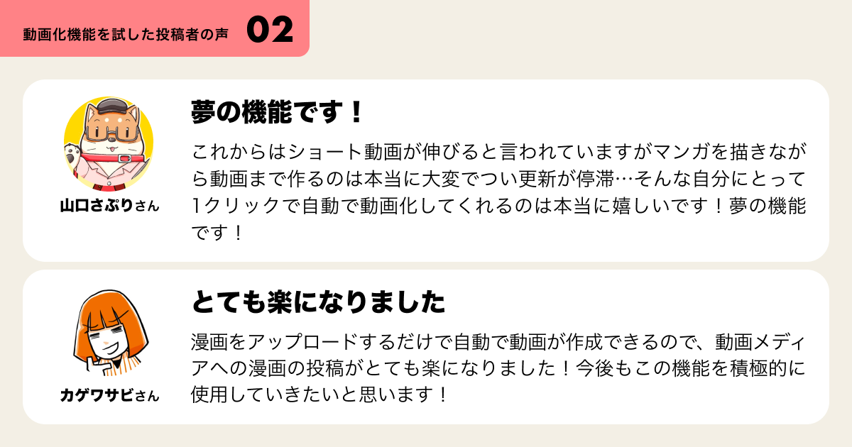 「YOMcoma」は、ショートマンガを創作するクリエイターへのヒアリングを毎週複数回実施し、サービス開発・改善を行っています。創作活動における多種多様な「困りごと」を解消する手段のひとつとして動画に着目し、マンガ画像から自動で動画を作成・ダウンロードできる機能をリリースしました。他にもショートマンガの創作活動や、作品をより多くの方に届けるための支援として、新たなサービスや機能を検証・検討しており、今後もクリエイターにとって価値のあるサービス開発・改善を行ってまいります。