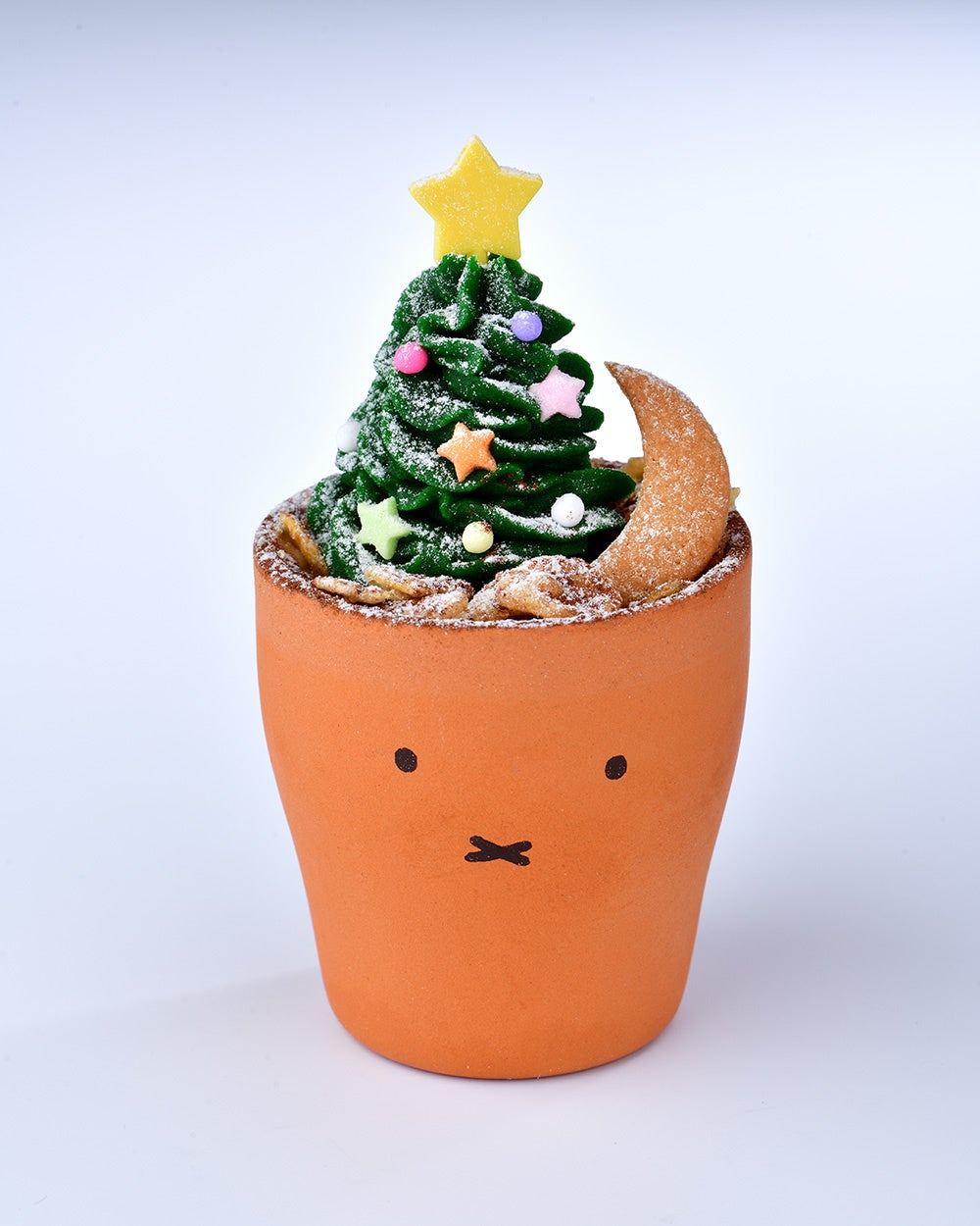 クリスマスツリーをイメージした冬季限定のティラミスです。甘さ控えめな白あんでできたツリーの上には星型のピック、側面には星型のチョコレートを飾り、月夜をイメージして月の形をしたクッキーを添えました。ミッフィーのお顔がデザインされた素焼きのポットの中には、ティラミスがたっぷりと入っています。素焼きのポットはアフターユースできるため、食べ終わった後はお花を植えて育てたり器としても利用できます。