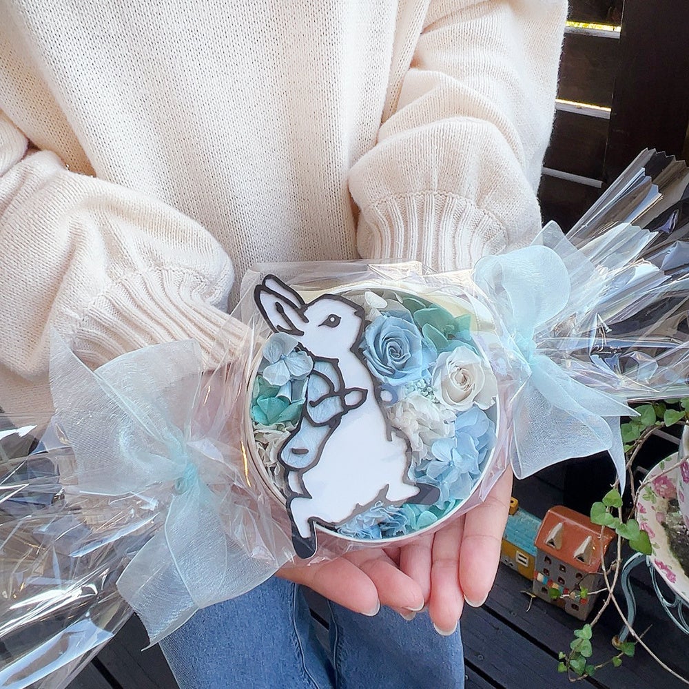 自身も大のうさぎ好きであるマイペリドット店主が、クリスマスやバレンタインデー、冬の誕生日に贈れる、うさぎ好きのためのフラワーギフトを作りたいという想いから企画した、冬の到来に心を躍らせるピーターラビット™を描いた冬季限定のフラワーBOX。