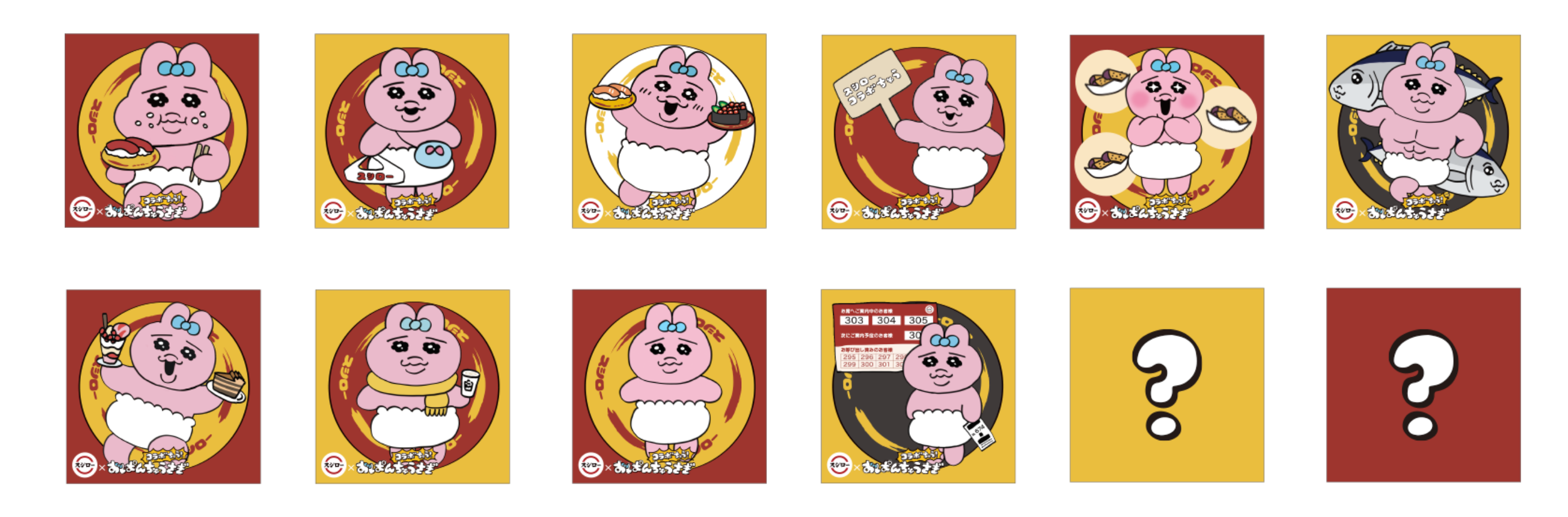 ※コラボピック(全14種)は対象商品1点につき、ランダムで1個お渡しさせていただきます。 ※仕入状況・販売状況により、予告なく販売を中断、または終了する場合がございます。 ※写真はイメージです。実際の商品とは異なる場合があります。 ※仕入状況・販売状況により、使用する食材が変わる場合があります。 ※2023年11月30日(木)に閉店する釧路店(北海道)、戸塚深谷店(神奈川県)、狭山店(大阪府)は「スシロー×おぱんちゅうさぎ」コラボキャンペーン対象外となります。 ※本キャンペーンは、お持ち帰り専門店「スシロー To Go」、「京樽・スシロー」は対象外です。 |