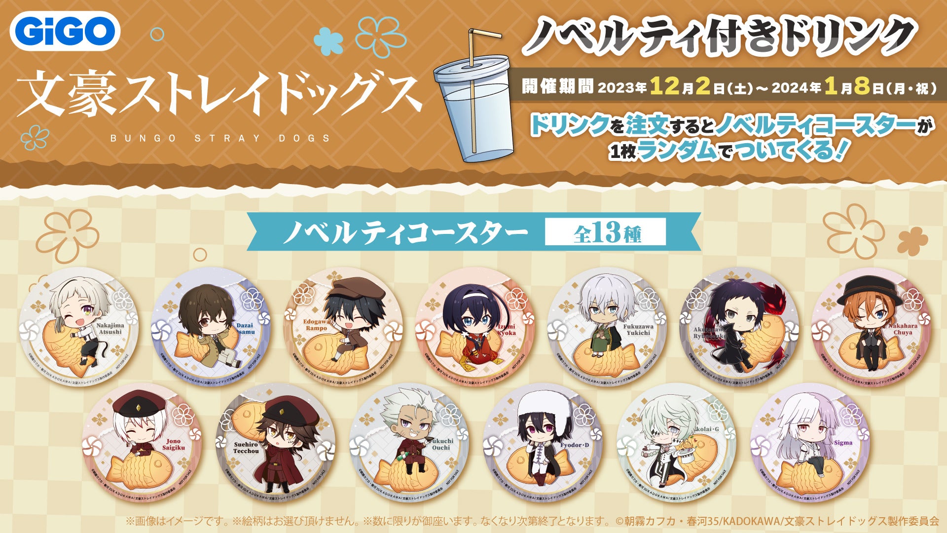 文豪ストレイドッグス焼き 1 個(500 円税込)ご購入につき、コースター(全 13 種:ランダム)を1枚プレゼント致します。