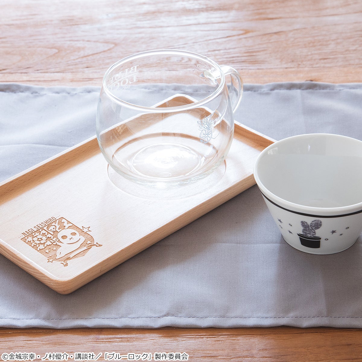 【サイズ】潔 世一 モデル(概寸)プレート:幅22.2cm×奥行10.4cm×高さ1.8cm、スタッカー:直径7.4cm×高さ3.8cm/蜂楽 廻 モデル(概寸)グラス:直径8cm×高さ10.3cm、スタッカー:直径7.4cm×高さ3.8cm/凪 誠士郎 モデル(概寸)マグカップ:幅12.5cm×直径10cm×高さ7.5cm、トレー:幅22cm×奥行12cm×高さ1.5cm、ボウル:直径9.8cm×高さ5.2cm/御影 玲王 モデル(概寸)プレート:直径22cm×高さ2cm、ボウル:直径9.8cm×高さ5.2cm