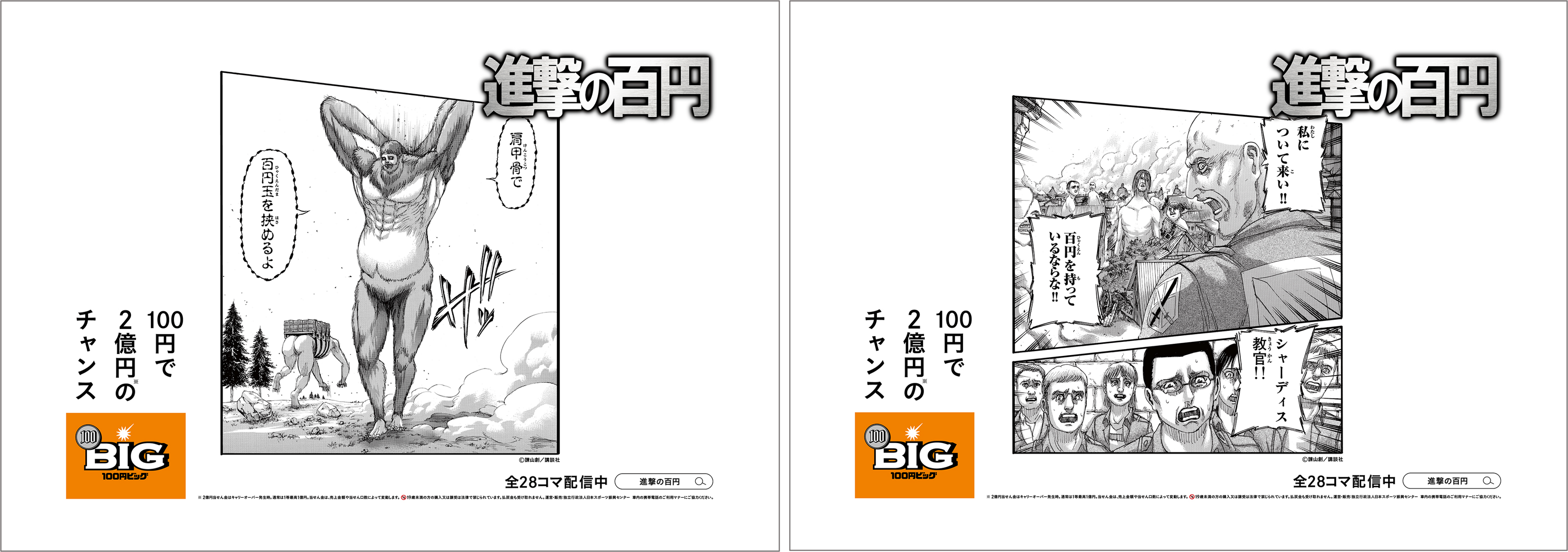 この度、お客様に「100円BIG」を楽しんでいただくために、コミックス累計発行部数が全世界で1億2,000万部を突破し、11月4日(土)にTVアニメ(「進撃の巨人」The Final Season 完結編)の放送を終えて話題となっている「進撃の巨人」とコラボし、作品の印象的なシーンを採用したオリジナル広告『進撃の百円』を2023年11月27日(月)より、都内交通広告や100円BIG公式サイト、公式Xで公開いたします。