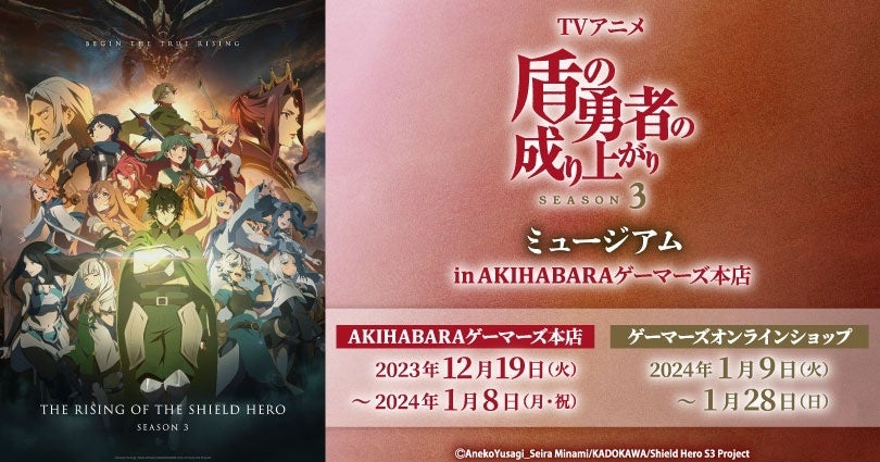 株式会社カードラボ ゲーマーズ(本社:東京都豊島区、https://www.gamers.co.jp/以下ゲーマーズ )は、2023年12月19日(火)よりTVアニメ『盾の勇者の成り上がり Season 3』ミュージアムin AKIHABARAゲーマーズ本店 を開催することをお知らせいたします。