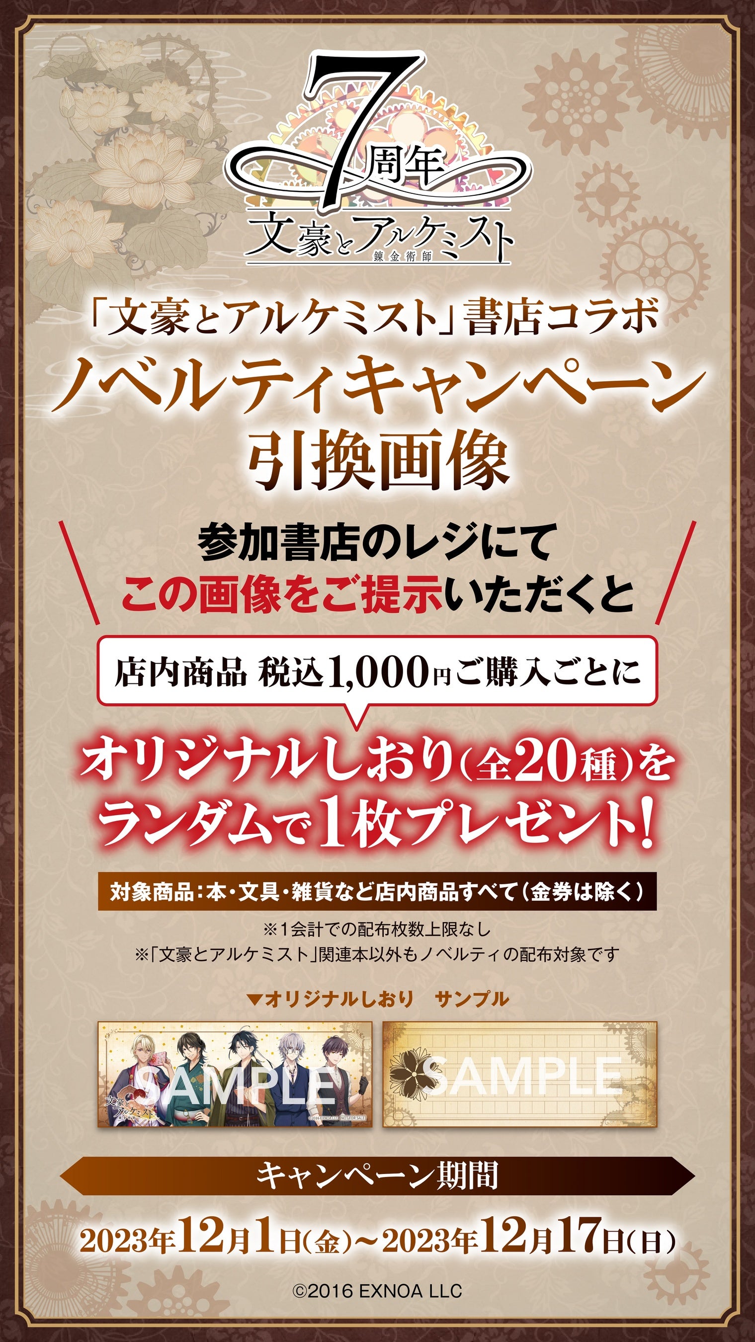 商品ご購入時に「文豪とアルケミスト」のオリジナルしおり(全20種)がもらえるノベルティキャンペーンのほか、全国85店舗の「特別応援店」にて、店舗ごとに異なる文豪を起用した特別ポスターの掲示など、様々な企画を実施いたします。
