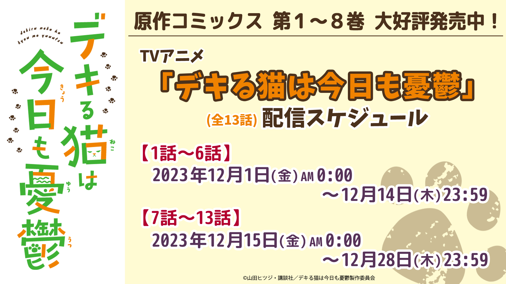 山田ヒツジ先生による『デキる猫は今日も憂鬱』が2023年7月よりTVアニメ化、MBS、TBS、BS-TBSほかにて放送され、9月末最終回を迎えました。これを記念して、講談社が運営するYouTubeチャンネル『フル☆アニメTV』にて、TVアニメ『デキる猫は今日も憂鬱』全13話を期間限定で順次無料配信いたします。【第1話~第6話】を本日12月1日から12月14日まで、【第7話~第13話】を12月15日から12月28日までの期間限定配信となりますので、原作と一緒にぜひお楽しみください!