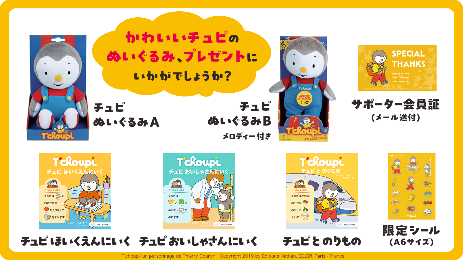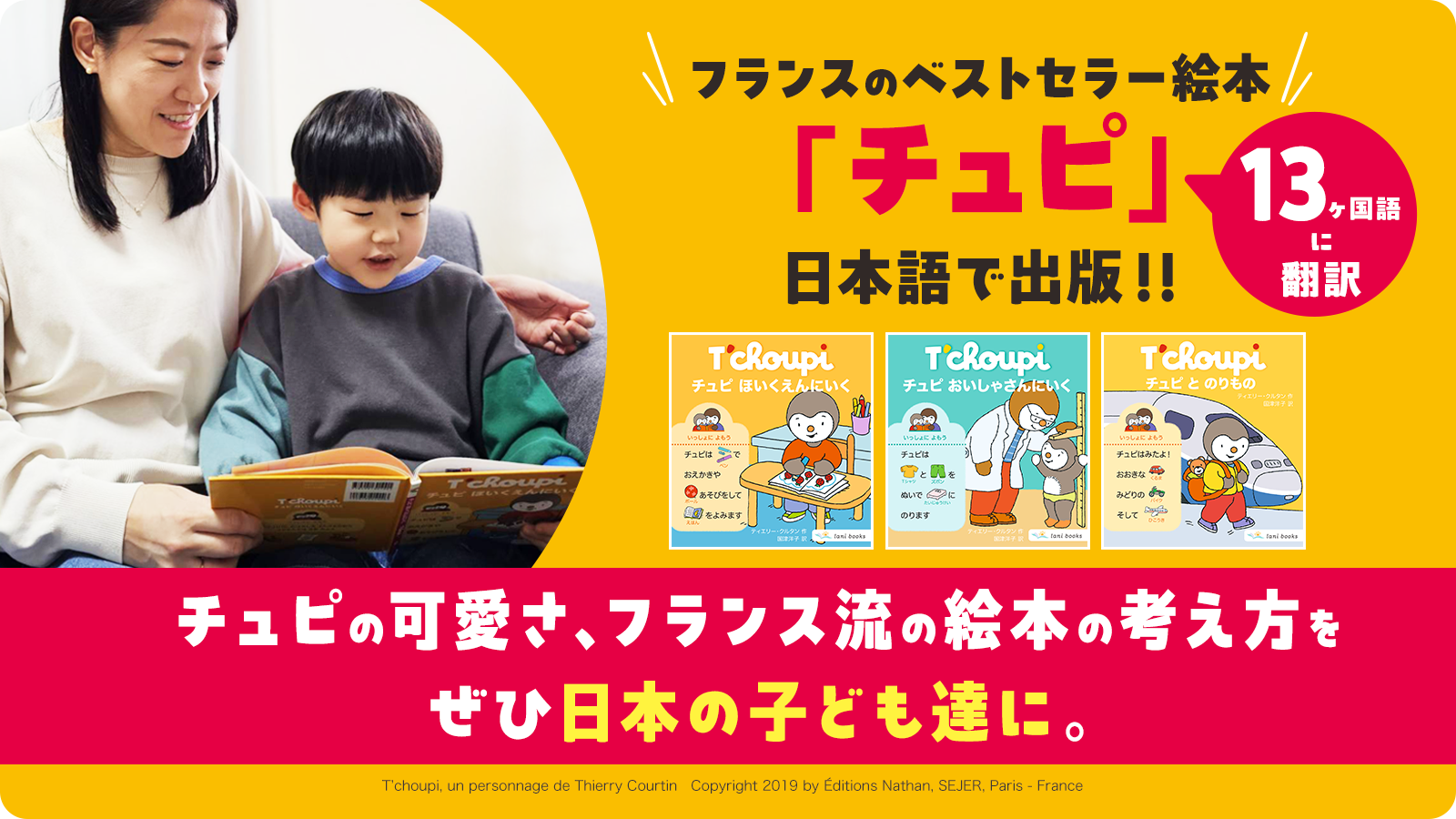 「チュピ(T’choupi)」シリーズは1990年代にフランスで生まれた絵本です。フランス累計販売部数2600万冊以上、世界13ヶ国(アメリカ、スペイン、南米、中国、韓国、ギリシャ、レバノン、ブラジル、イスラエル、ポルトガル、台湾、トルコ、ポーランド)で展開するベストセラーです。