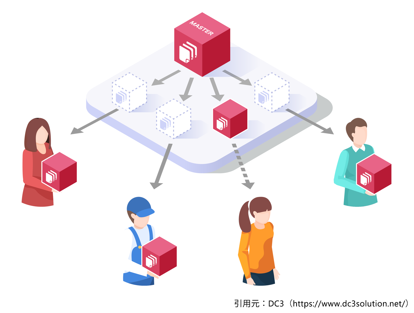 DC3コンテンツでは、コンテンツ製作者(著作者)が予め設定したロイヤリティ(収益分配率)に基づいた収益を還元する仕組みを実現。これにより、製作者は自身の作品を販売した後も流通する毎に一定の収益を得ることができます。 -