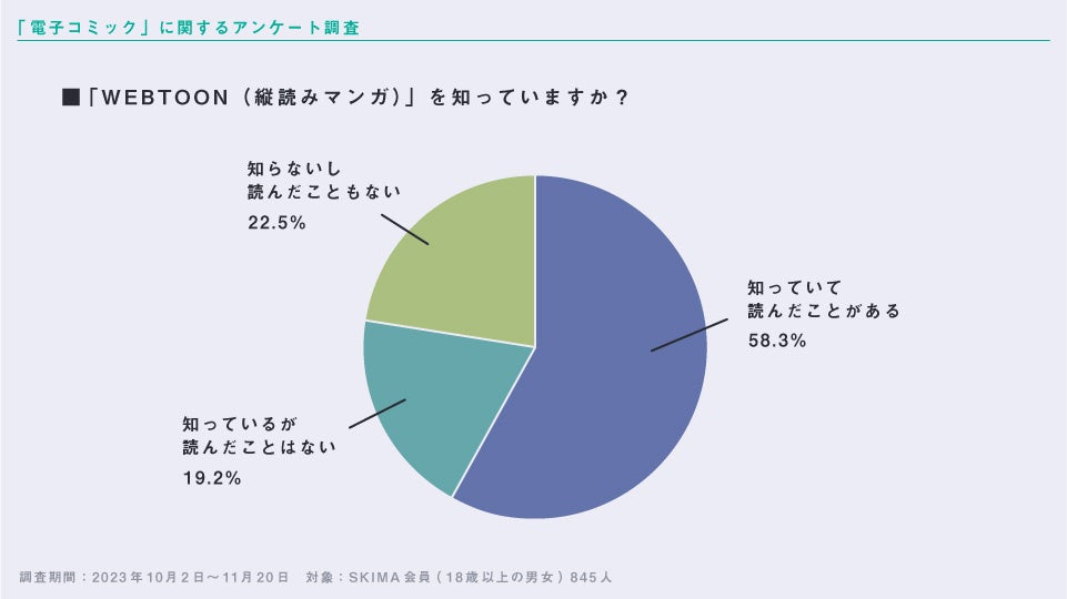 「WEBTOON(縦読みマンガ)」を知っていますか?の質問に対し、「知っていて読んだことがある」の回答は58.3%だが、「知らないし読んだこともない」が22.6%とまだ認知されていない層もいることがわかりました。