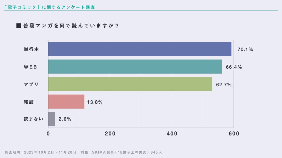 「普段何でマンガを読んでいますか?」と質問したところ、1位「単行本」が70.1%、2位「Web」が66.4%につづき3位「アプリ」62.7%、4位が「雑誌」で13.8%となりました。