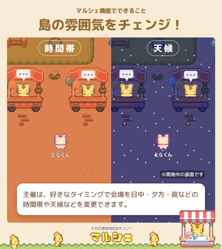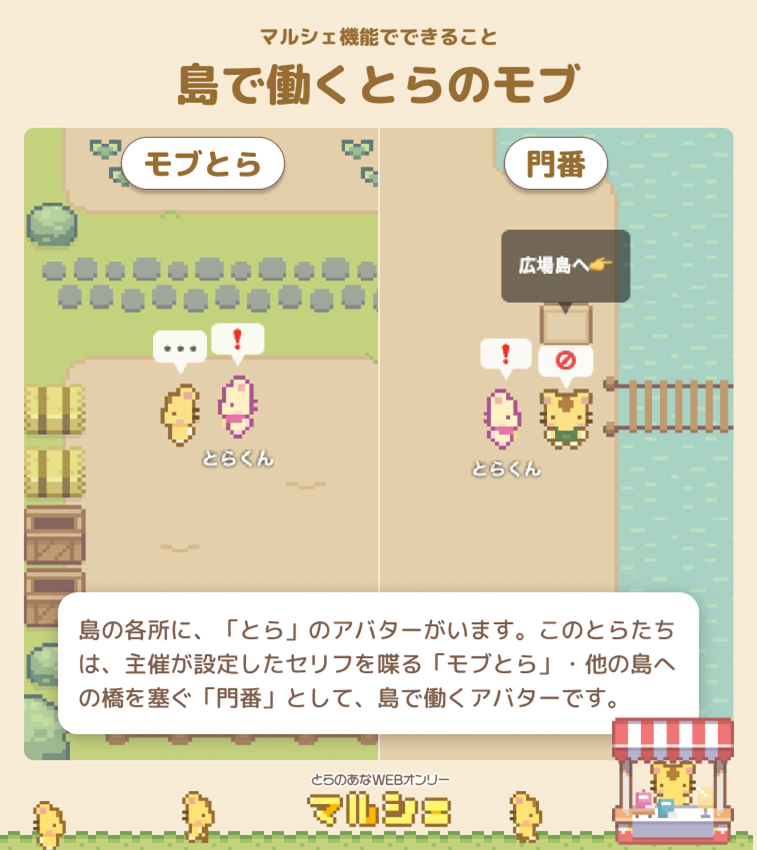 また島の各所に、主催が設定したセリフを喋る「モブとら」・他の島への橋を塞ぐ「門番」など、島で働く「とら」のアバターがおり、それぞれの役目をはたしています。