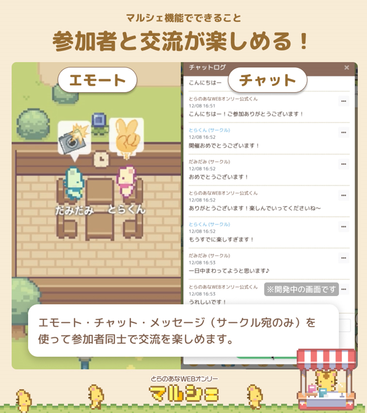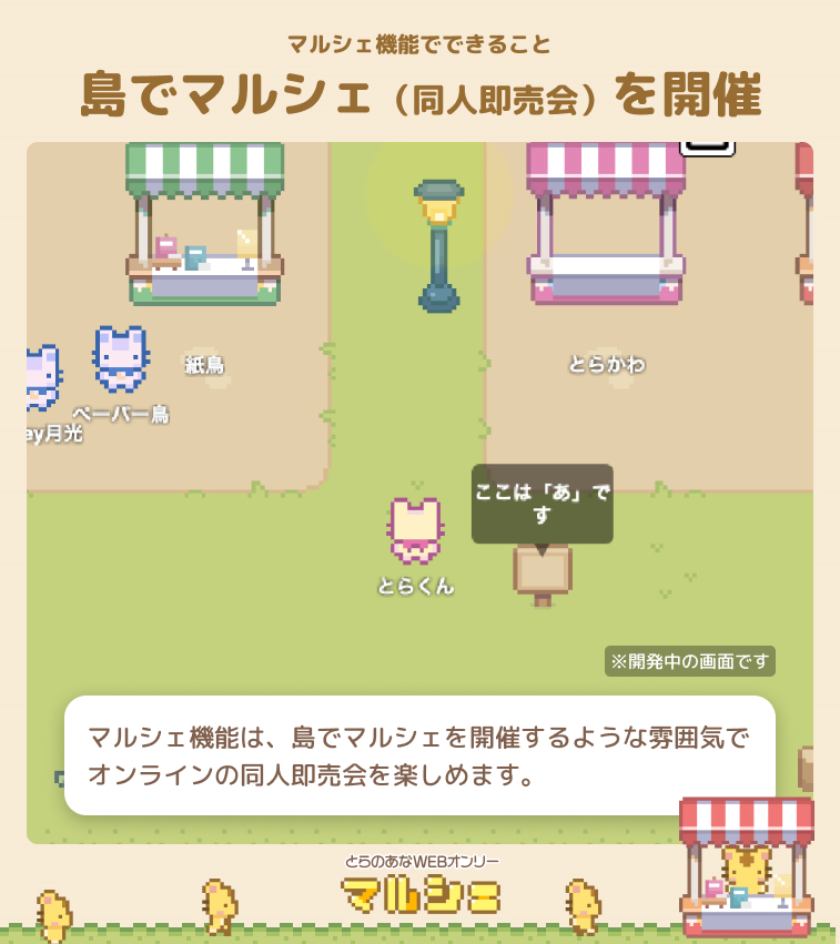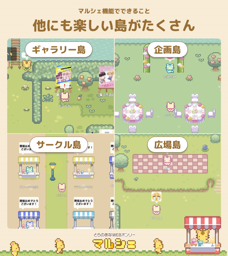このたび「とらのあなWEBオンリー」に新たに「マルシェ機能」が登場しました。”マルシェ”とはフランス語の”市場”という意味で、「マルシェ機能」を追加いただくとWEBオンリー上の島でマルシェを催すような雰囲気でアバターキャラを操作し、リアルタイムで参加者同士が自由な交流を行うことが可能となります。ぜひこの機会に「とらのあなWEBオンリー」をご利用ください。
