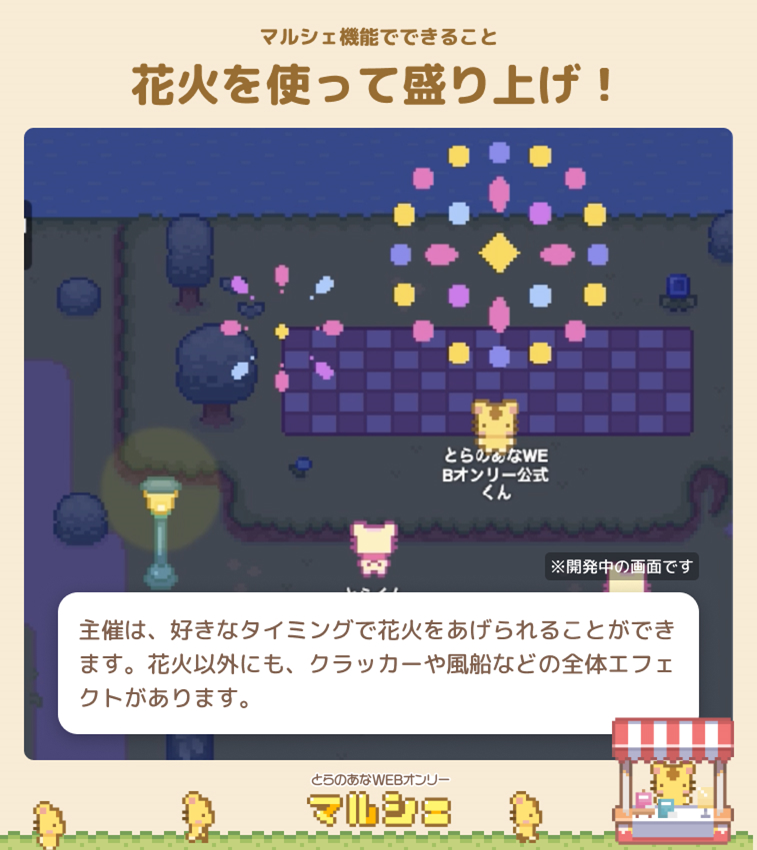 イベント主催は、好きなタイミングで花火をあげることができます。花火以外にも、クラッカーや風船などの全体エフェクトがあり、開始終了の合図・コアタイムの盛り上げ企画として楽しめます。