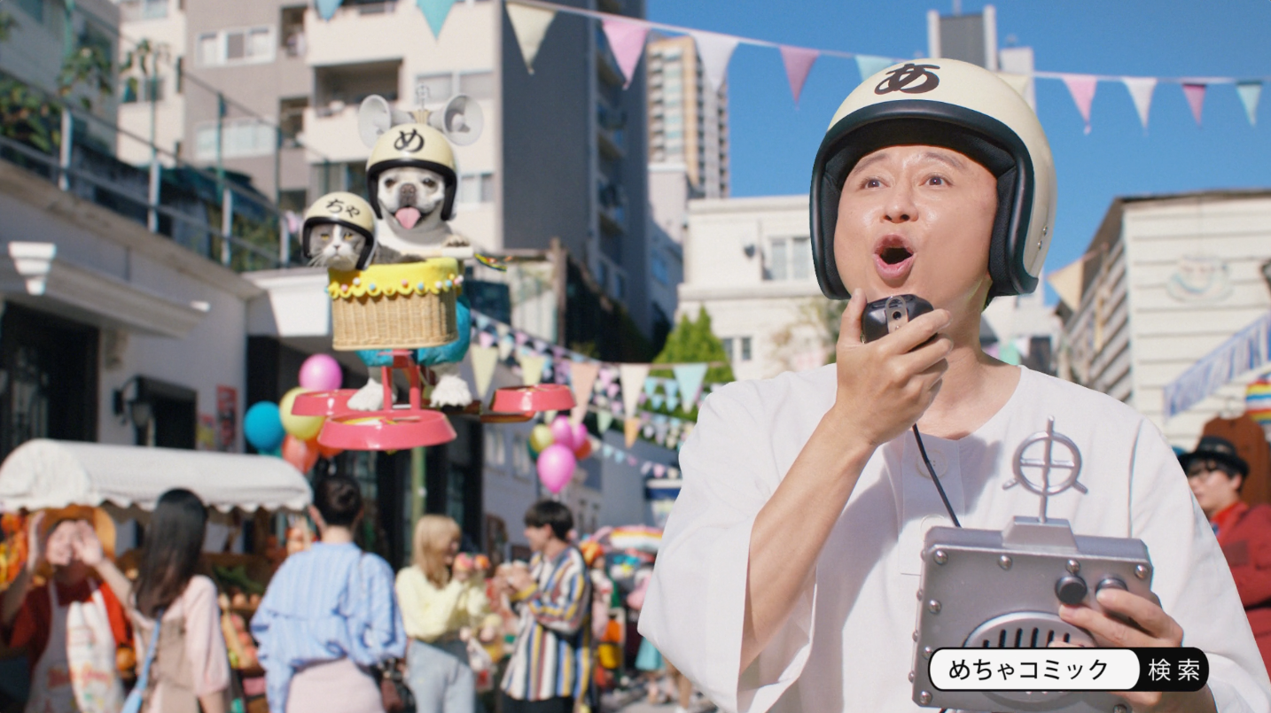 今回の「ドローン篇」、「無料コミック篇」は、めちゃ犬とちゃめ(猫)が空からドローンに乗って登場!人々の注目を集めながら街を飛ぶドローン。そのスピーカーからは何やら聞き覚えのある声が……。ドローンを操っていたのはやはりあの人だった!?
