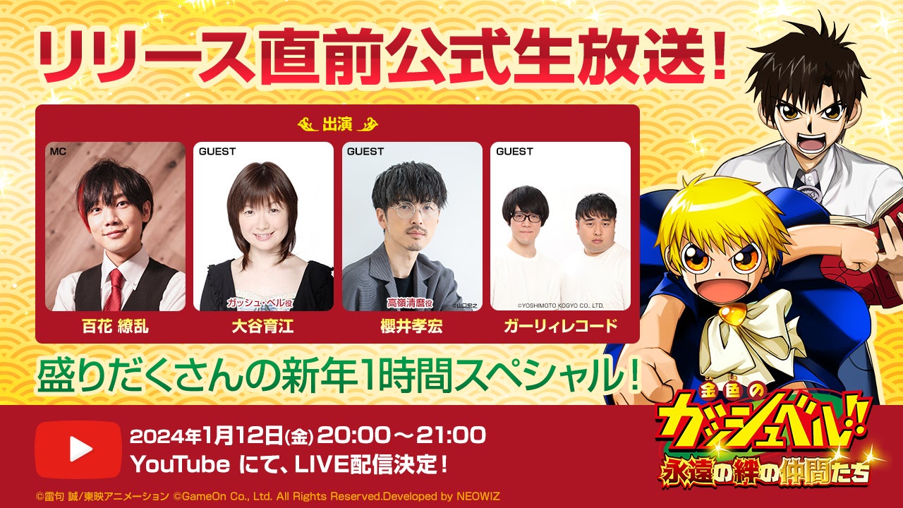 当生放送では、百花繚乱さんがMCを務め、ガッシュ・ベル役の大谷育江さん、高嶺清麿役の櫻井孝宏さんをゲストにお迎えします。また、人気キャラの1人であるキャンチョメのモノマネでもお馴染みのお笑い芸人ガーリィレコードのお二人も登場します。