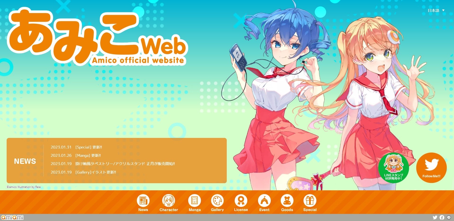 「あみこ」の公式ホームページ。様々なイラストレーターが描く「あみこイラスト」、あみこ参加イベントの情報などを掲載。この他に、三面図・設定画も掲載し立体イベントでの「アマチュア版権」「法人版権」の受付も行っています。