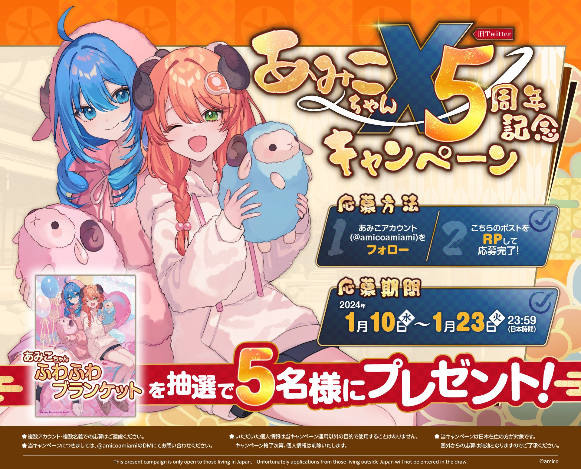 大網株式会社(本社・東京都文京区)は、自社が運営するホビーショップ「あみあみ」イメージキャラクターあみこのX(旧Twitter)アカウント5周年を記念して、「あみこちゃんふわふわブランケット」を抽選でプレゼントするキャンペーンをX(旧Twitter)で開催中です。
