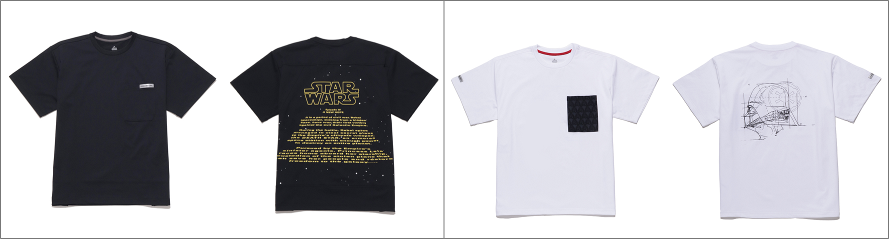 商品特徴 :肌触りがよく、ストレッチ性と吸汗速乾性がある綿タッチポリエステル素材を採用。映画のオープニングクロールや人気キャラクタ―を背中にプリントしました。