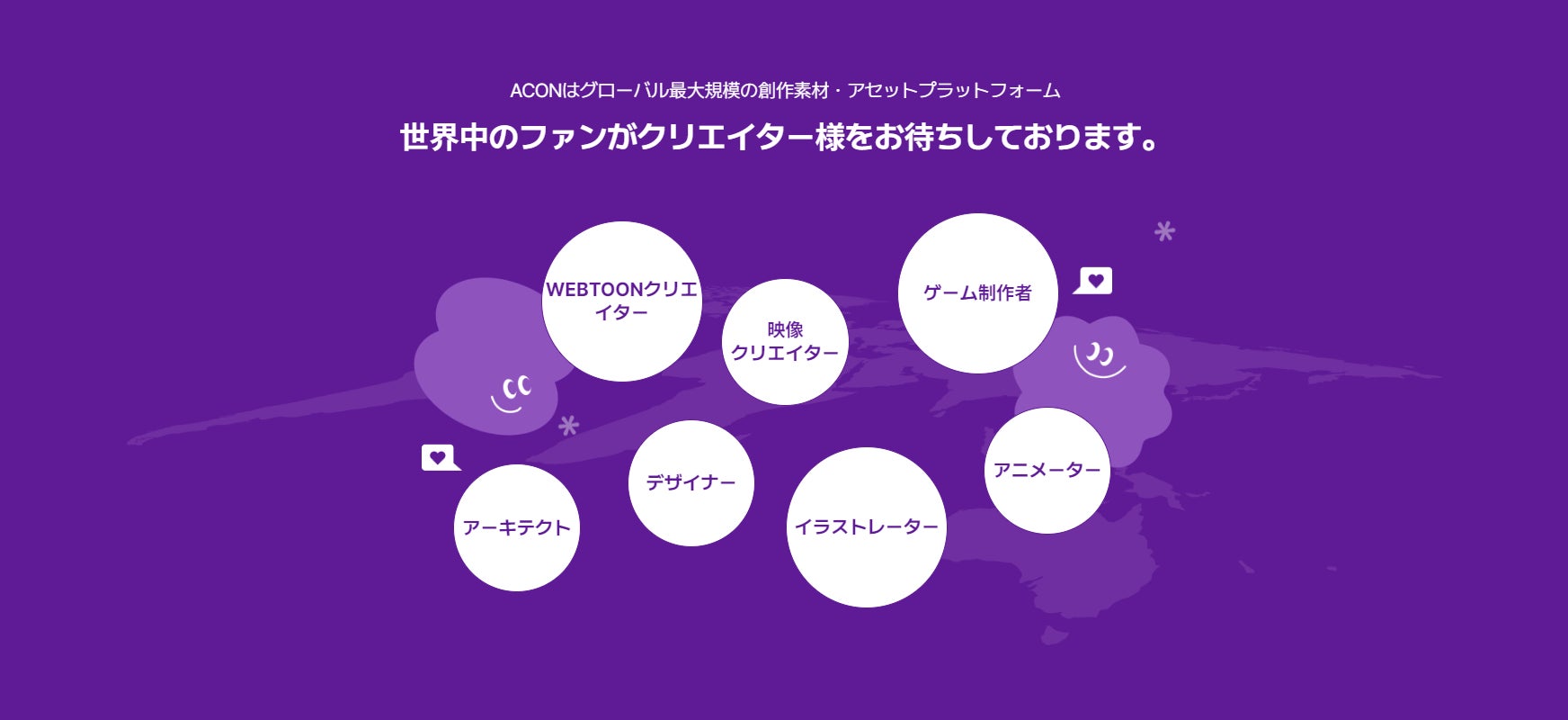 ACONは韓国を代表する漫画・WEBTOON素材のプラットフォームであり、全世界150ヶ国余りの漫画・WEBTOONクリエイターにご利用いただいております。韓国ではWEBTOONクリエイターの90%以上がACONの素材を活用しており、2023年からは日本でも毎四半期ごとに最高の売り上げを記録しています。それ故、ACONは日本の漫画・WEBTOON市場への進出計画を明らかにし、日本クリエイターの素材出店を積極的に推進しています。
