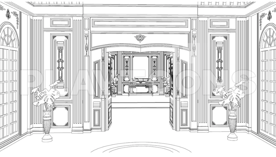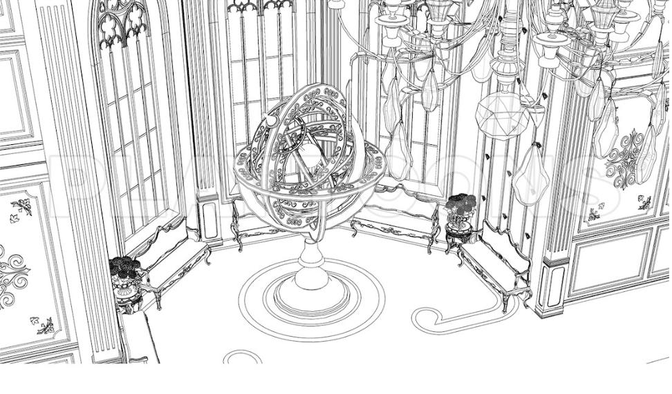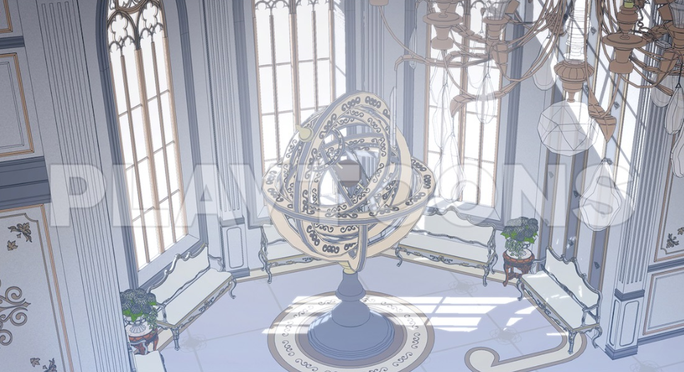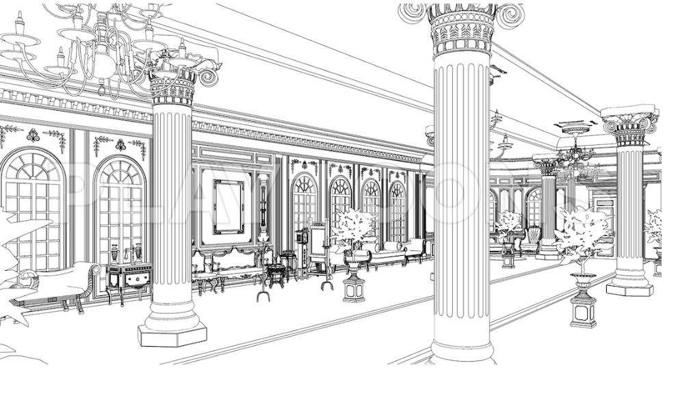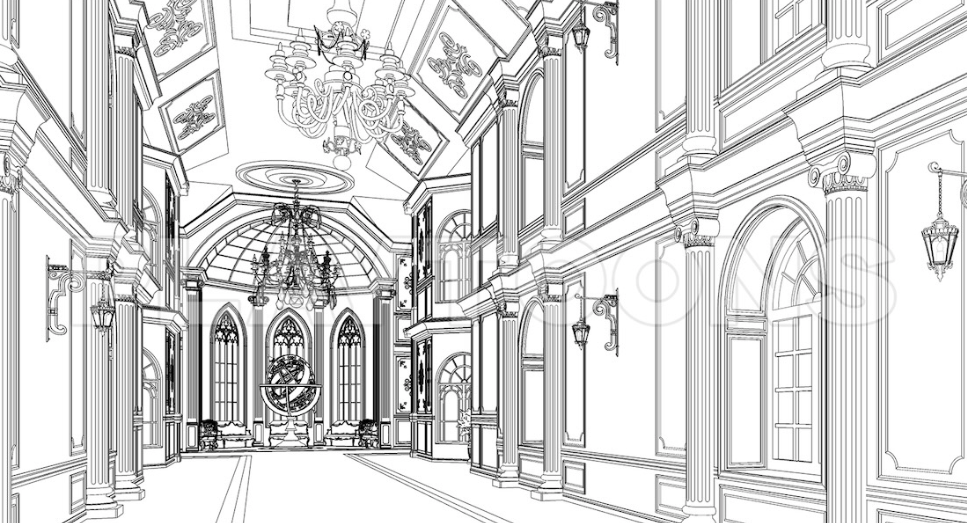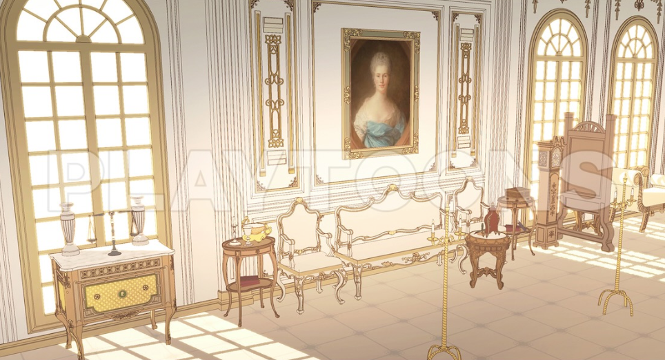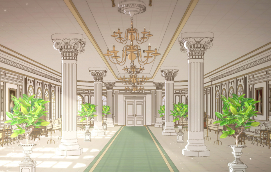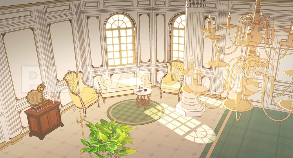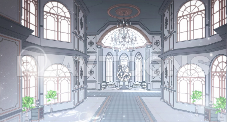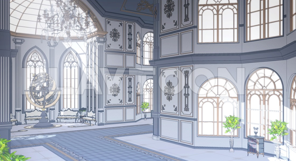 大きな窓から光が注ぎ、壁には高級感のある装飾品やシャンデリアが飾られています。