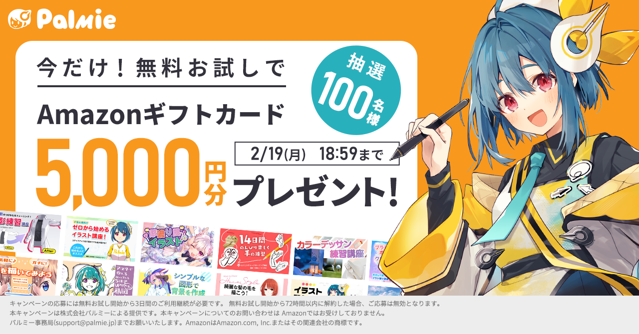株式会社パルミー(所在地:東京都港区、代表取締役:大野英紀、以下パルミー)は、本日2024年2月9日(金)12時00分〜2024年2月19日(月)18時59分までの期間、無料お試しで抽選100名様にAmazonギフトカードをプレゼントするキャンペーンを開催いたします。