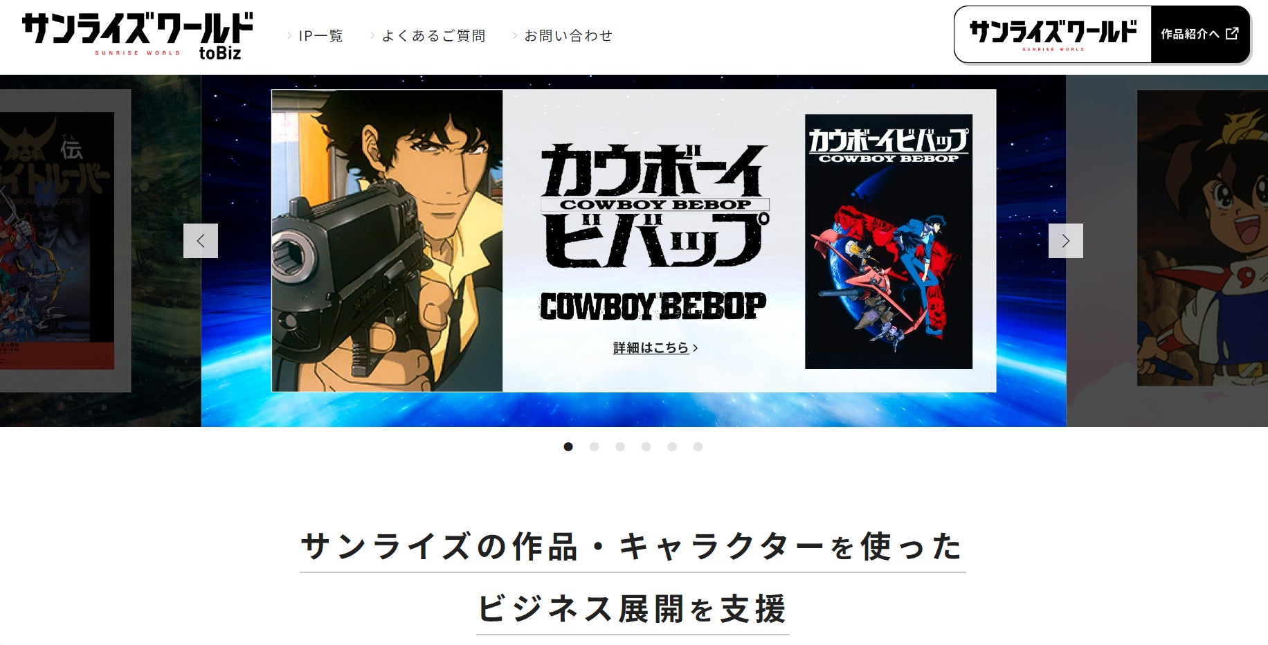 「サンライズワールドtoBiz」では、ライセンシー様向けにサンライズIPである作品・キャラクターを使った様々なビジネス展開を支援いたします。