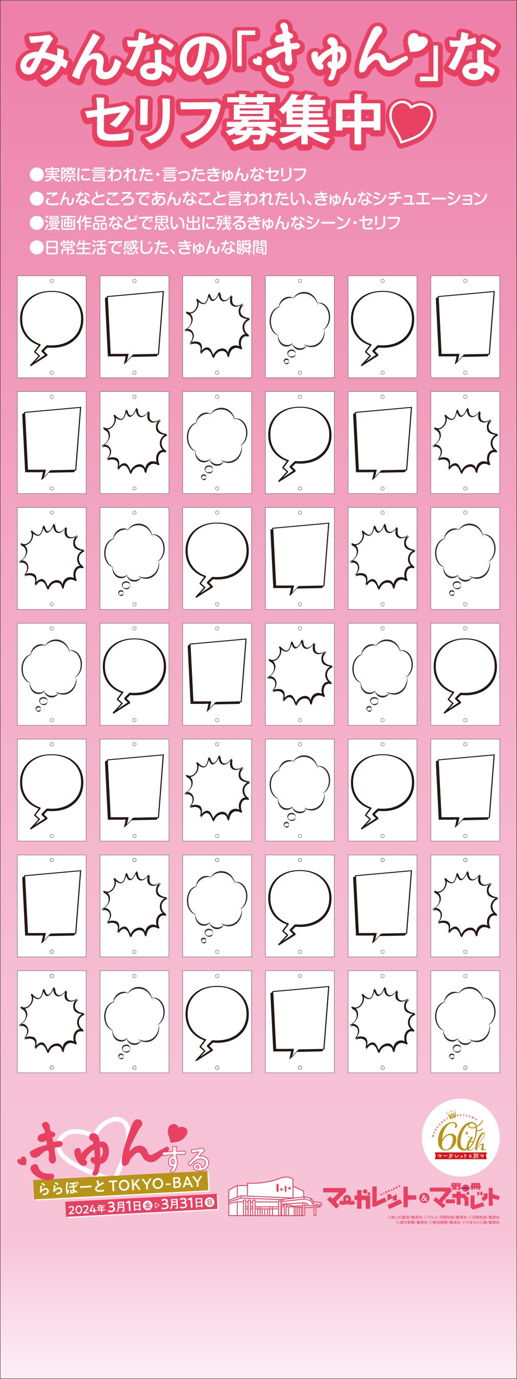 三井不動産商業マネジメント株式会社(所在:東京都中央区、代表取締役社長:大林 修)が運営する、三井ショッピングパーク ららぽーとTOKYO-BAYは、2024年3月1日(金)~3月31日(日)の期間、創刊60周年を迎えた「マーガレット」「別冊マーガレット」とコラボレーションした企画「きゅん♡する ららぽーとTOKYO-BAY」を開催します。