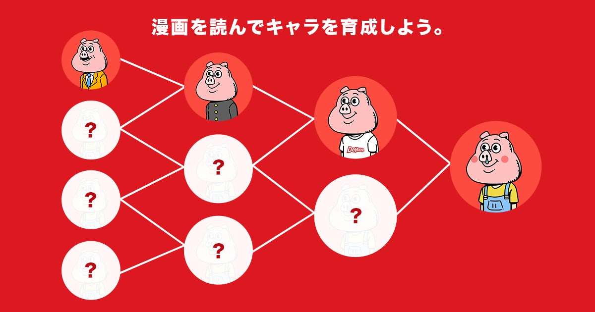 DeMangaのオリジナルキャラクター「ピッグ」を育てることでよりたくさんの応援(投票)ができます。漫画を読むことでピッグ育成に必要なアイテムをゲットできます。