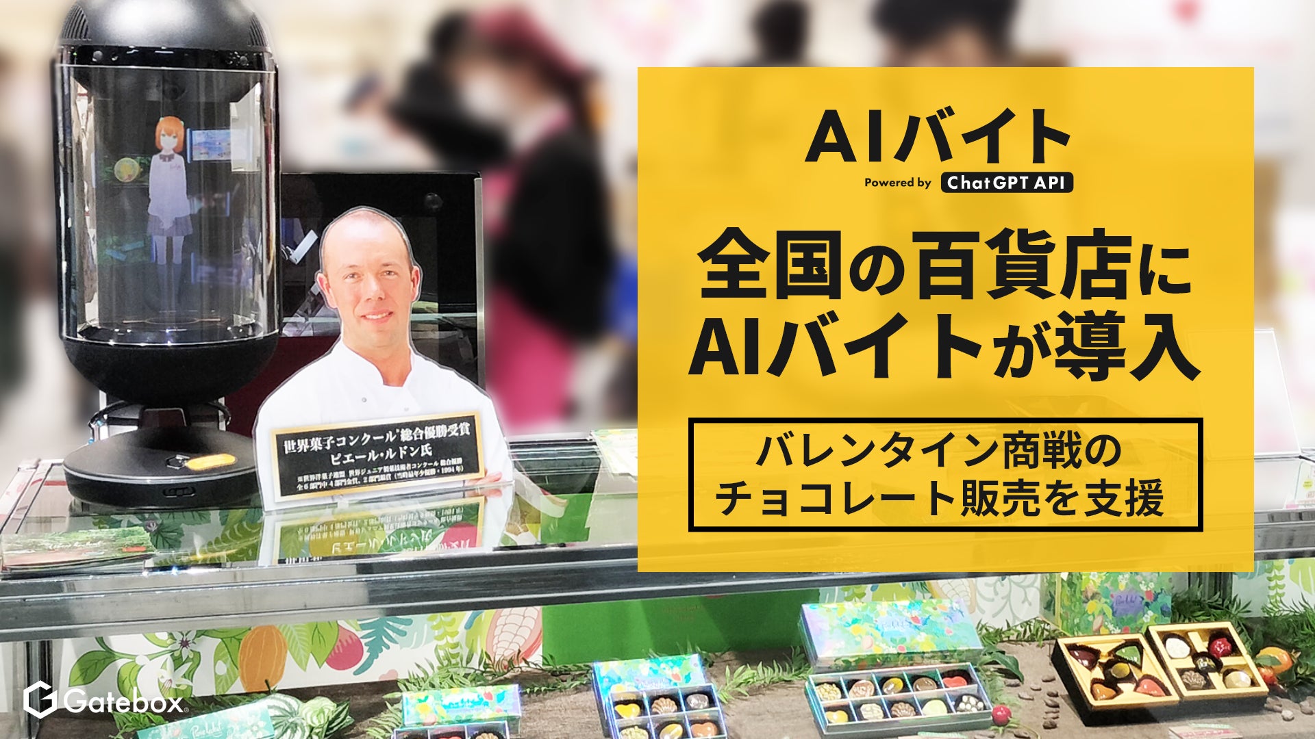 Gatebox株式会社(東京都千代田区、代表取締役 武地 実)が提供する、「ChatGPT」と連携したAIキャラクターが企業の接客業務を行うサービス「AIバイト」が、催事場での接客業務を担当するため全国の百貨店に登場しました。バレンタイン商戦で各社が魅力を競う中、「ピエール・ルドン」「ノイハウス」2つのブランドのチョコレート販売で、AIキャラクターが接客業務を行いました。