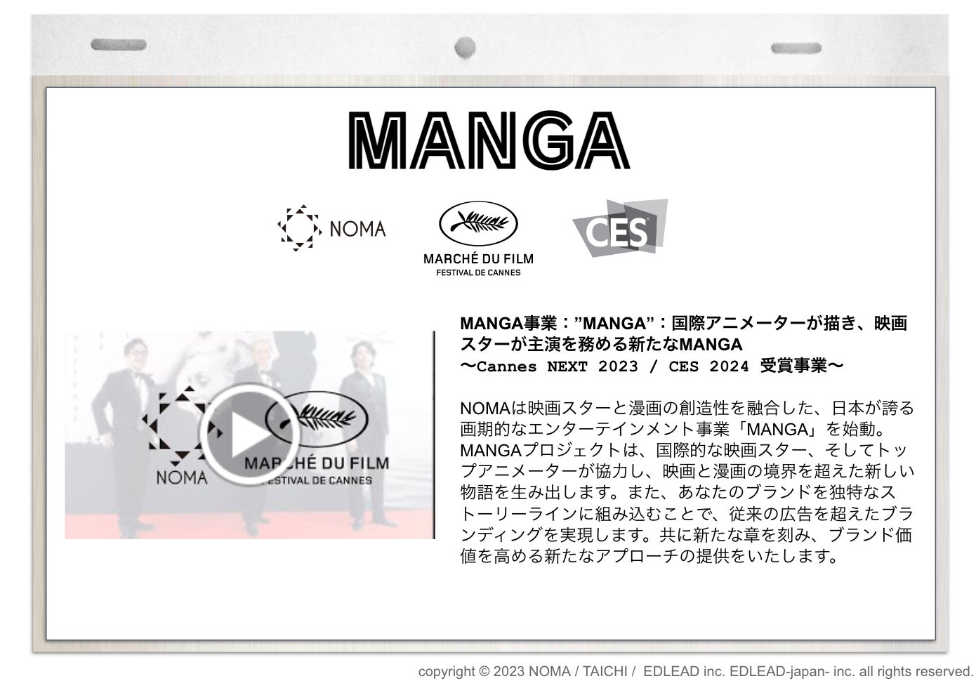 国際映画スタジオのNOMA(ノマ)は、ジブリ作品「風の谷のナウシカ」から「もののけ姫」、「ONE PIECE FILM RED」を手がけた国際アニメーターらとともに、MANGA事業における第一弾作品の制作を開始しました。本事業は、2023年の第76回カンヌ国際映画祭「Marché du Film」メインステージで開催されたピッチイベントや世界最大のテクノロジー見本市CES® 2024で受賞した事業であり、映画業界などからも注目されている事業です。