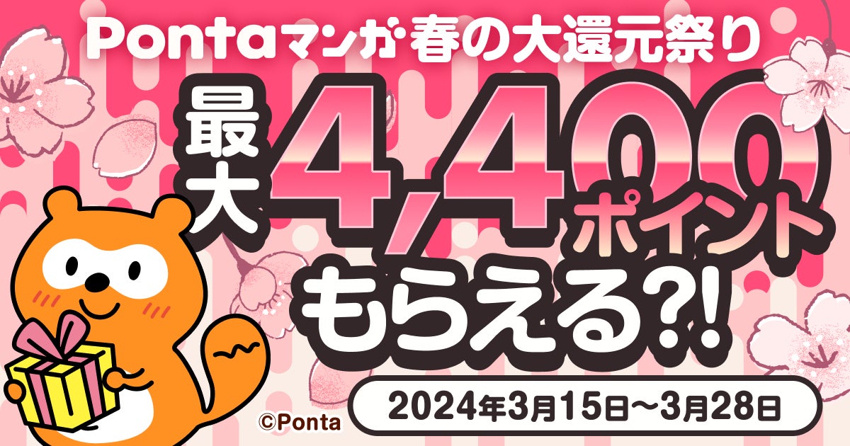 「Pontaマンガ」は、Pontaアプリをはじめ、PontaWebなどのPontaオウンドメディアから利用できる総合型電子マンガ書店です。このたびの「Pontaマンガ 春の大還元祭り」では、期間中に2つのPontaポイントプレゼント企画を実施します。1つ目は、Pontaマンガにログインして、マンガを読んでいただいた方に最大16Pontaポイントをプレゼントする企画です。ログイン日数や読んだ作品数が増えるほど、獲得できるポイント数がアップします。2つ目は、マンガを読むためのコインを購入いただくと、たまるPontaポイントが通常時の20倍となる企画です。最大で4,400Pontaポイントを還元します。