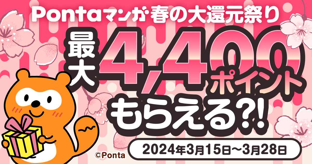 「Pontaマンガ」は、Pontaアプリをはじめ、PontaWebなどのPontaオウンドメディアから利用できる総合型電子マンガ書店です。このたびの「Pontaマンガ 春の大還元祭り」では、期間中に2つのPontaポイントプレゼント企画を実施します。1つ目は、Pontaマンガにログインして、マンガを読んでいただいた方に最大16Pontaポイントをプレゼントする企画です。ログイン日数や読んだ作品数が増えるほど、獲得できるポイント数がアップします。2つ目は、マンガを読むためのコインを購入いただくと、たまるPontaポイントが通常時の20倍となる企画です。最大で4,400Pontaポイントを還元します。