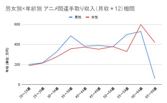 (図8:アニメ業界従事者の男女別、年代ごとの平均アニメ関連収入)