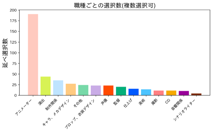 今回の調査は「低収入・長時間労働」などアニメ業界におけるイメージが実態とどの程度合致・乖離しているのかを改めて確認し現状の把握を行うことで、今後の政策提言等に活かすために実施しました。職種別の有効回答数を見ると全体の59%、191人がアニメーターであり、次いで多かったのが44人の演出、35人の制作関係で、その後キャラ・メカデザイン(27人)、プロップ・衣装デザイン(23人)、声優(23人)、監督(20人)、仕上げ(15人)、美術(14人)、撮影(11人)、CG(11人)、音響関係(10人)、シナリオライター(4人)と続きました。(図1)調査では職種を問わず回答してもらいましたが、今回の結果報告ではプリプロダクション、およびプロダクション工程の職種にしぼった分析を見ていきます。アニメ業界の中で声優は働き方が他職種と一線を画すことが改めて確認されたため、今後声優に特化した調査を予定しています。