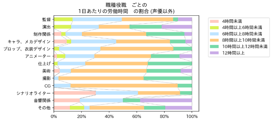 (図4:アニメ業界従事者の職種ごと1日あたりの労働時間の分布)