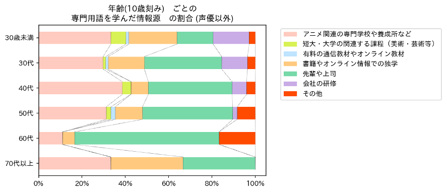 (図13:声優を除く年代別職業知識の情報源の分布)
