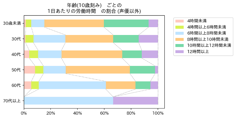 (図3:声優を除くアニメ業界従事者の年代ごと1日あたりの労働時間の分布)