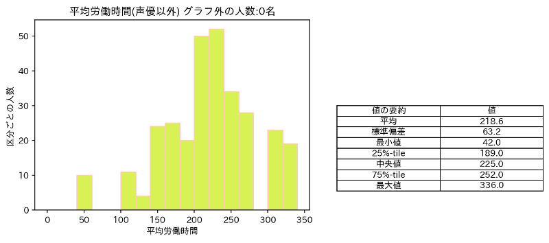 ・アニメ業界従事者の月間平均労働時間は平均が219時間、中央値が225時間であり、最大値では月間で336時間働いている。