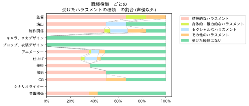 これらのハラスメントを職種別に見ると制作関係者がハラスメントを受けた経験が最も多く、これは制作関係者が監督や演出などの発注サイドとアニメーターなど受注サイドの間での連絡役を担い、且つ一人で多数の人と関わる必要があるポジションであることの難しさが数字に表れたと言えるでしょう。(図14)