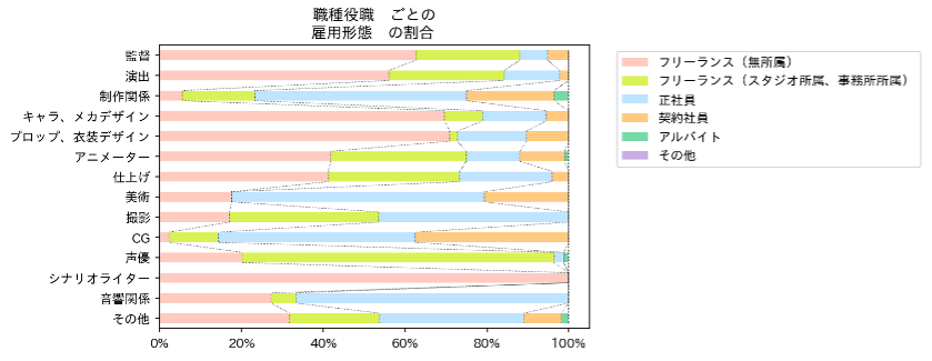 ここまでを見ると正社員、契約社員のメリットが非常に少ないように見えますが、特にキャリアを始める初期段階では固定収入があることは生活の支えとなるため、その後のキャリアを伸ばしやすくなるなどメリットは大きく、今後の業界全体を考えた時にも社員化を進めることは重要だと考えます。アニメ業界の人材不足、スキル不足を脱却するためにも、制作会社各位にはスタッフの社員登用を引き続き推進いただきたいと思います。