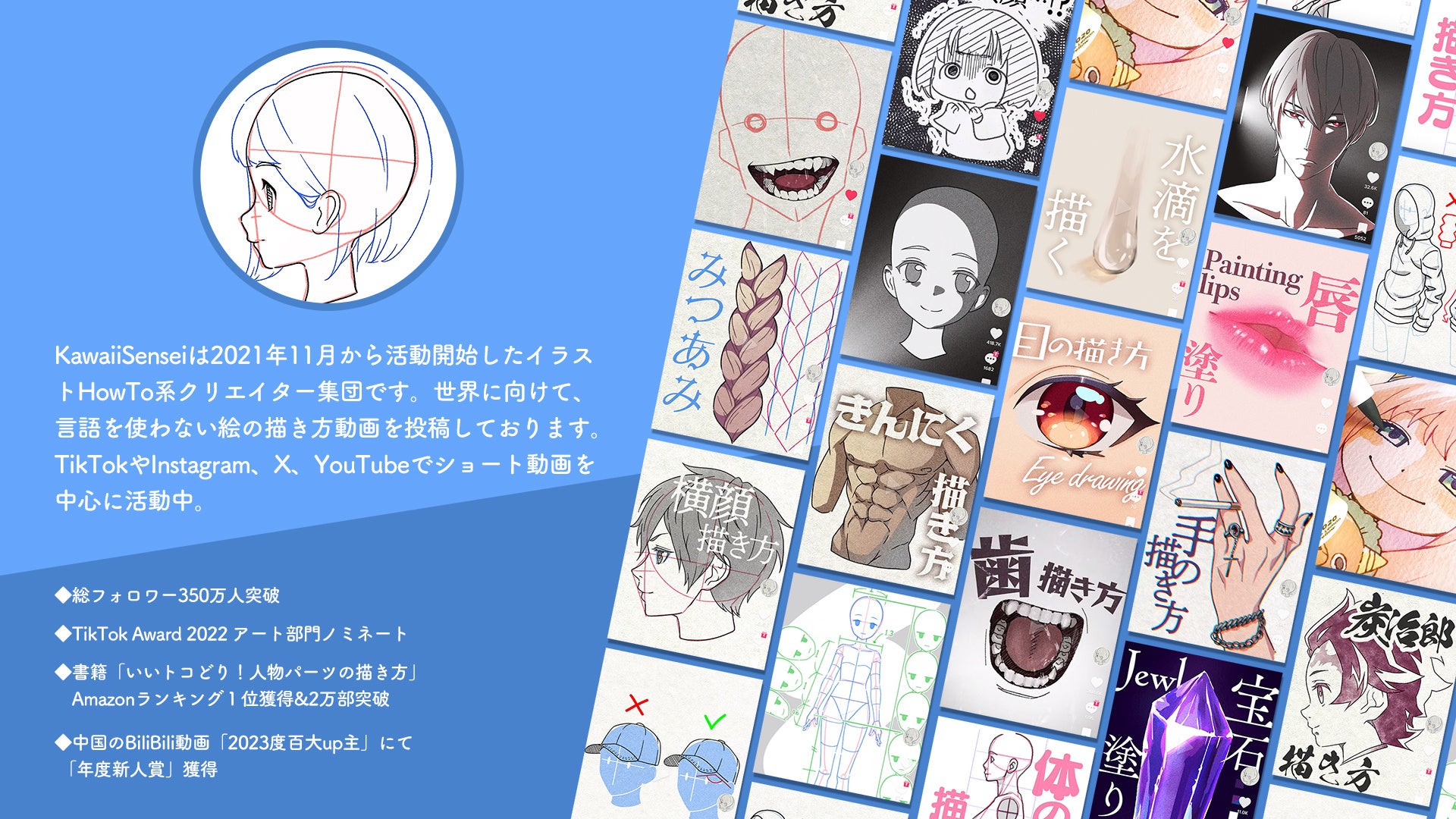 仲間と絵に向き合える絵の学校「イラストアカデミア」を創設し、世界一の絵の学校を目指す。そのほかにも、イラストの技術やテクニックを動画や画像でコンテンツ化して投稿するSNSアカウント「KawaiiSensei」を運営。非言語でわかりやすいショートTIPSを提供し、現在では総フォロワー350万人を超え、国内外で広く視聴されています。