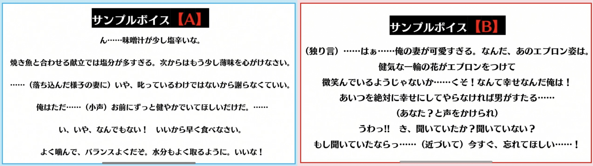サンプルAは夫婦の食卓の様子。サンプルBはエプロン姿の妻に悶える旦那様の心の声。投票中には置鮎と名塚が自炊トークを繰り広げます。「料理は毎日する」という名塚。「常備菜とか作る。夜帰って料理する時間をなるべく短くしたいんですよ、子どもたちが待てないから」とこだわりを話します。一方の置鮎は「コロナ下で料理に目覚めた瞬間もあった。でも常備菜とかにチャレンジしようとしたけど、1、2回しかやらなかった。そしたら今では全然できなくなっちゃった」と大笑い。名塚も「やらないと忘れちゃいますよね!」と同意します。