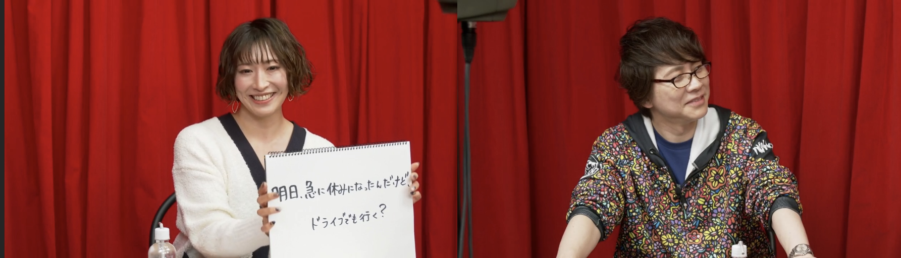 置鮎が愛たっぷりに「明日急に休みなったけど、ドライブ行く?」とマイクへ囁くと、名塚は「きゃー!行く!」と絶叫。「ありがとうございます、幸せでした」と200%楽しみました。